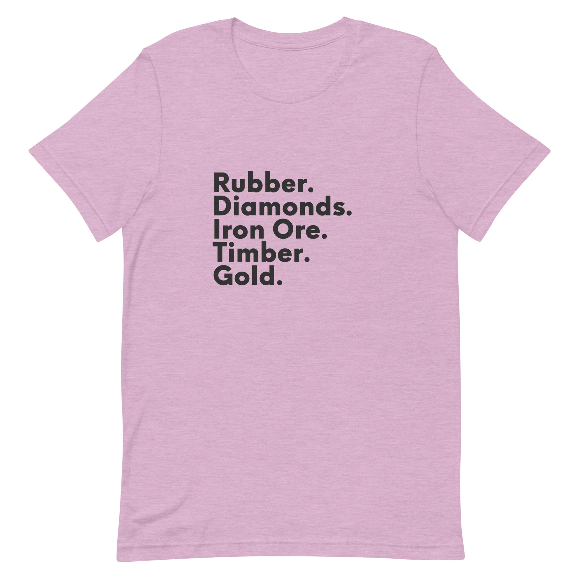 This crew neck t-shirt pays homage to the African diaspora. It highlights African history and the minerals and resources that enrich our soils and lands across border lines.