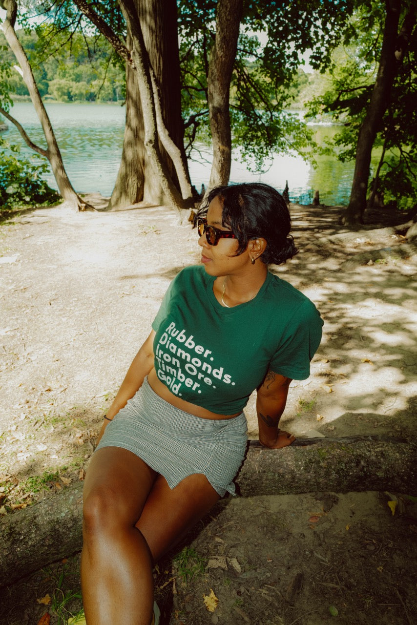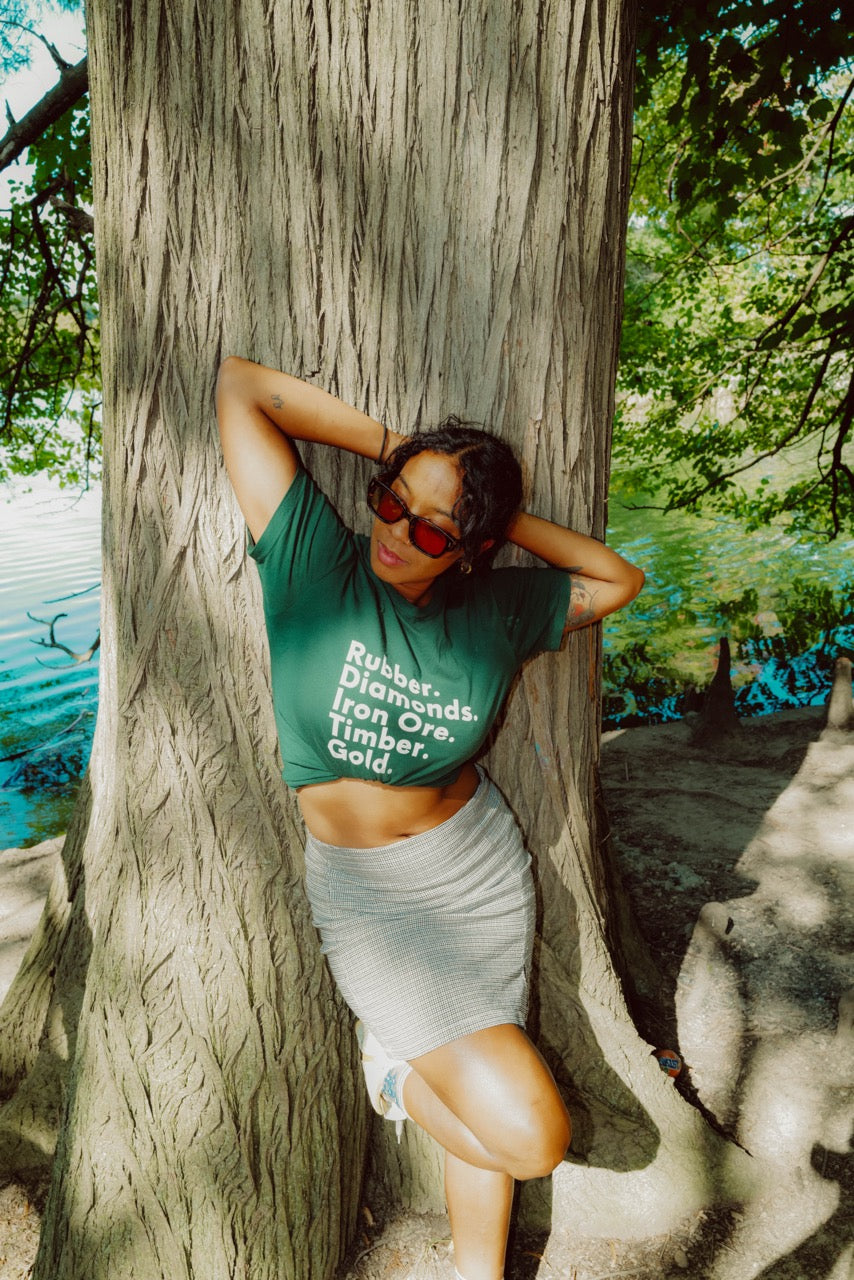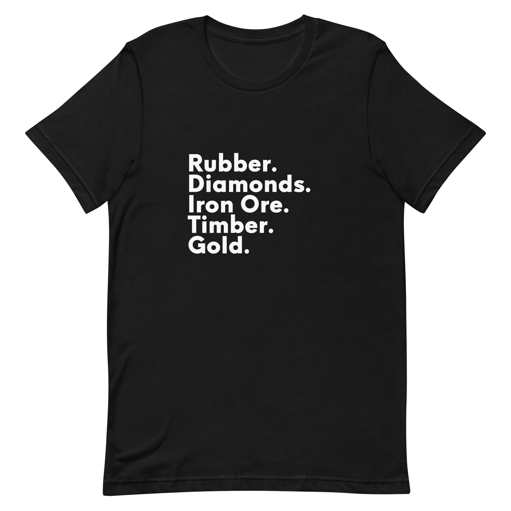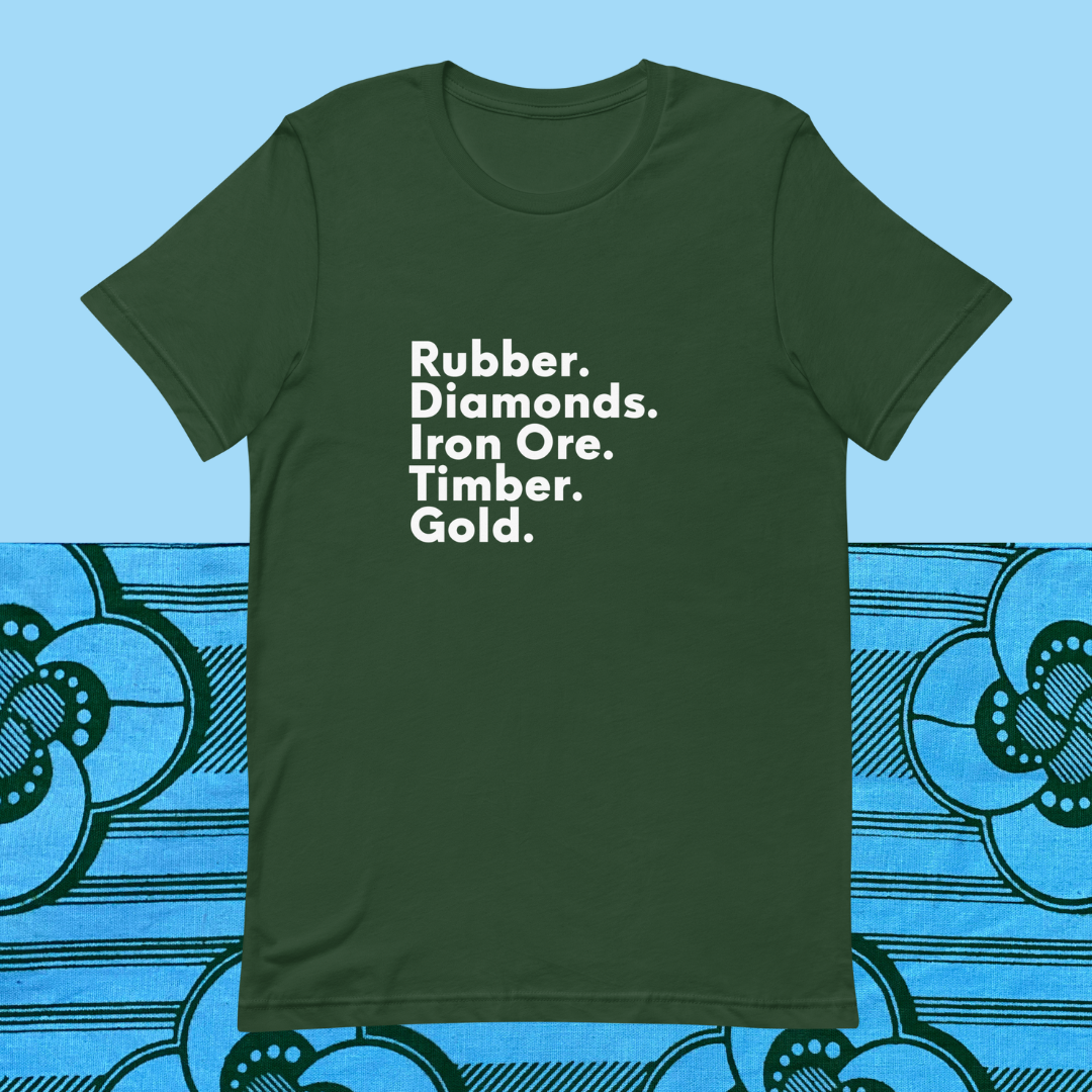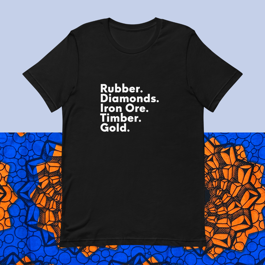This crew neck t-shirt pays homage to the African diaspora. It highlights African history and the minerals and resources that enrich our soils and lands across border lines.